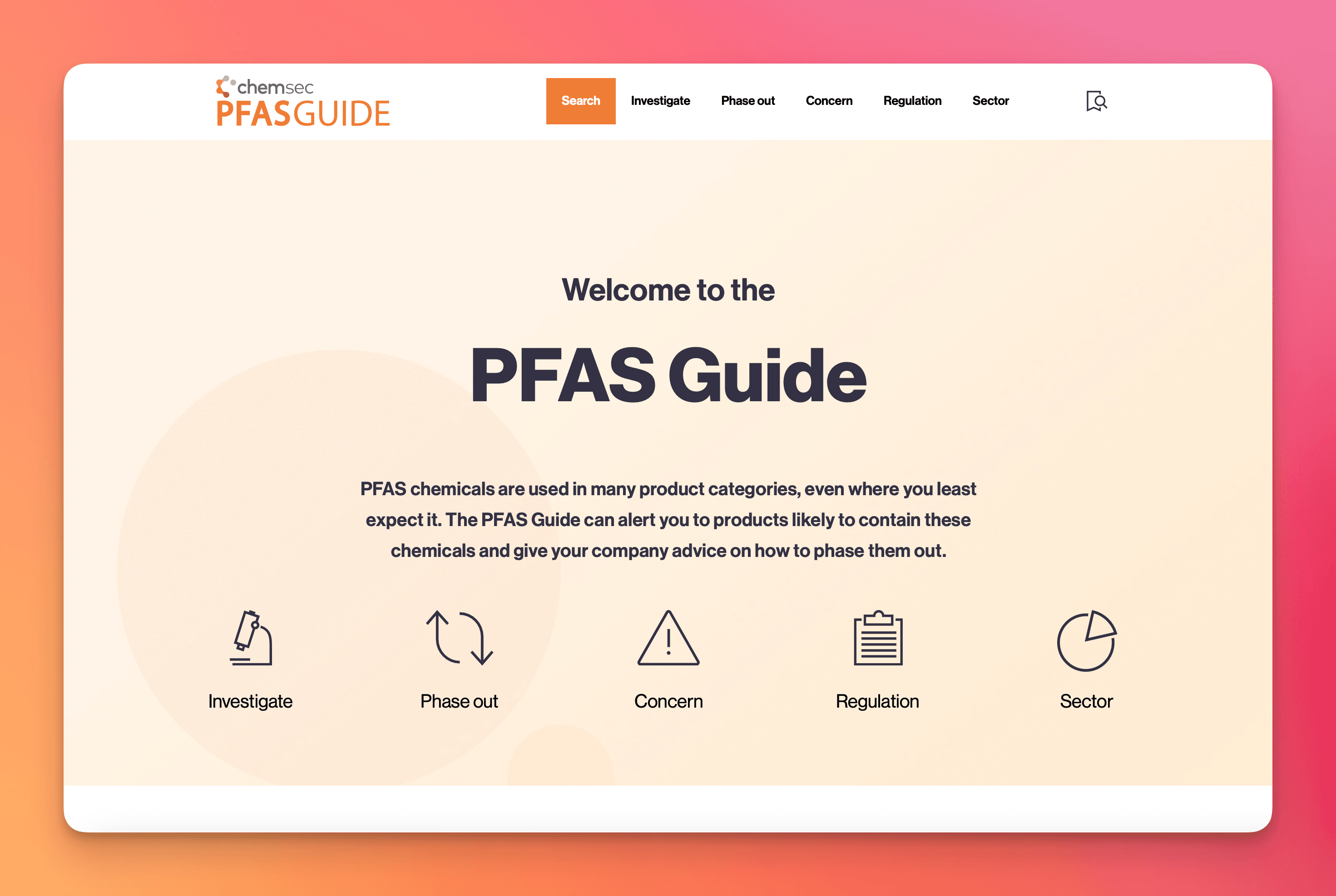 Listar produktkategorier där det giftiga ämnet PFAS är ofta förekommande. Sidan är byggd av oss på Itiden för Chemsec.