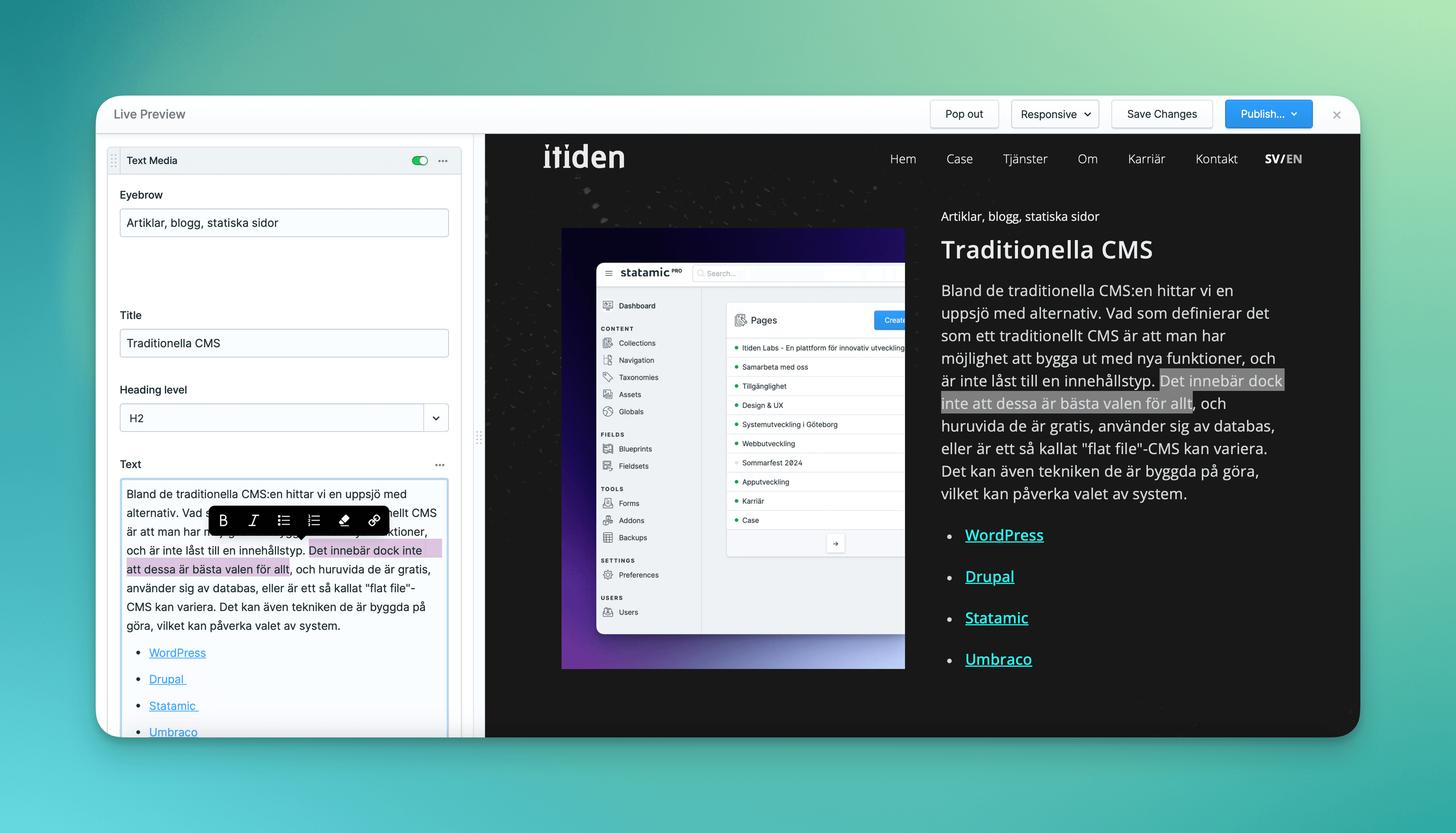 Flexibelt för redaktören med många möjligheter att anpassa sitt innehåll