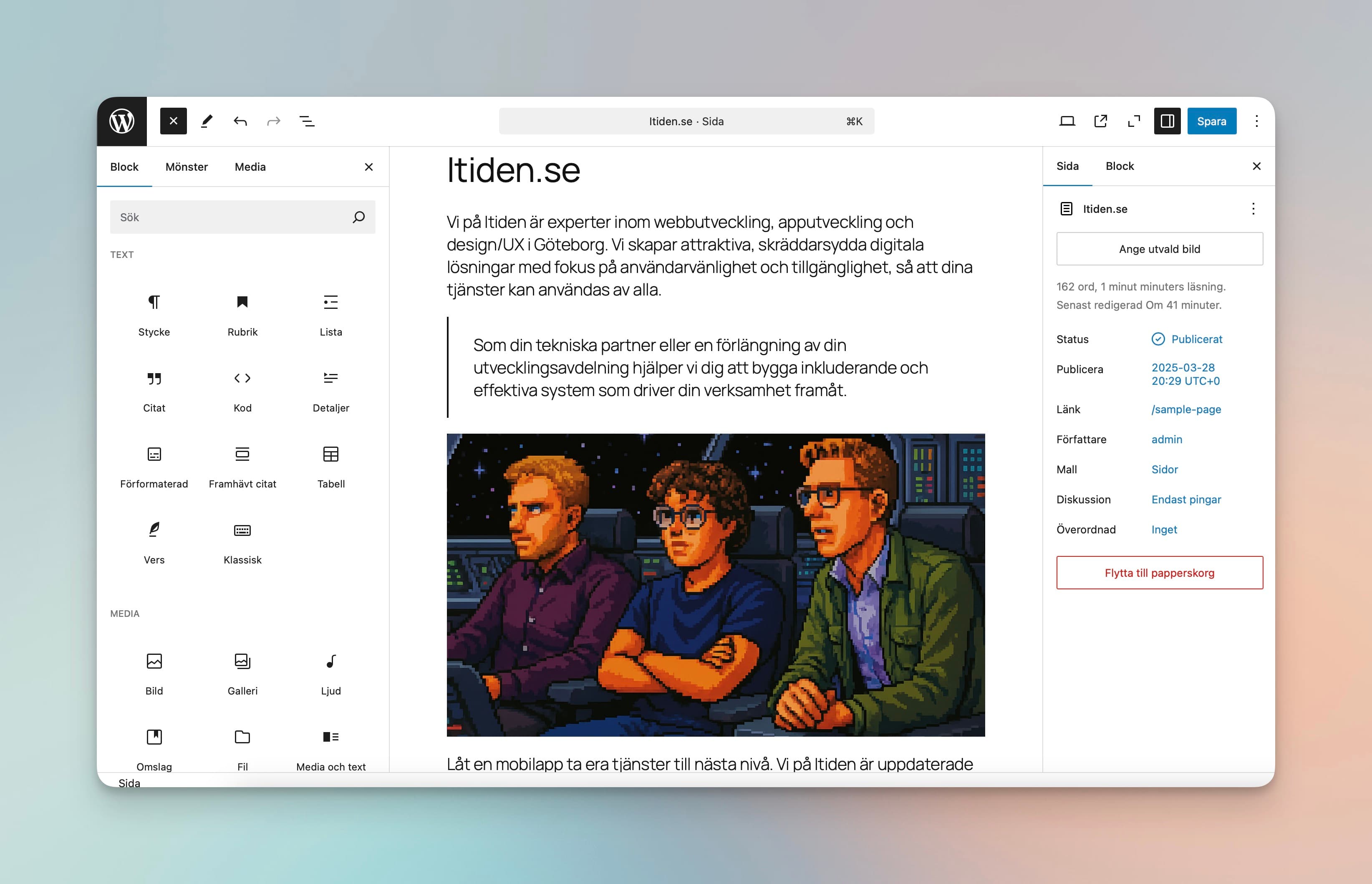 Itiden är experter på webbutveckling, apputveckling och design/UX. Vi har vår bas i Göteborg och utvecklar digitala lösningar tillsammans med våra kunder. Resultatet ska alltid vara attraktiva, användarvänliga och tillgängliga tjänster. Arbetssättet är flexibelt och effektivt och vi tror på samarbeten som präglas av enkelhet, engagemang och arbetsglädje.