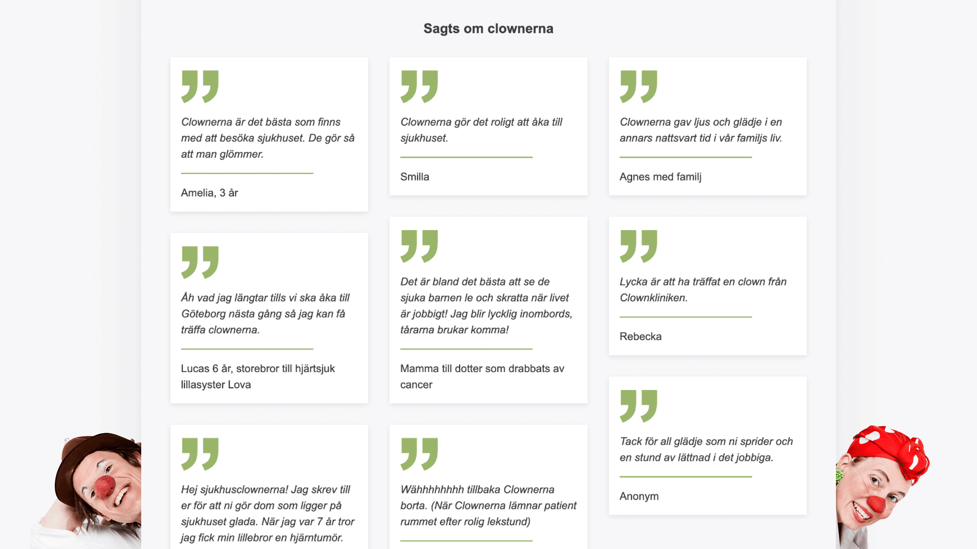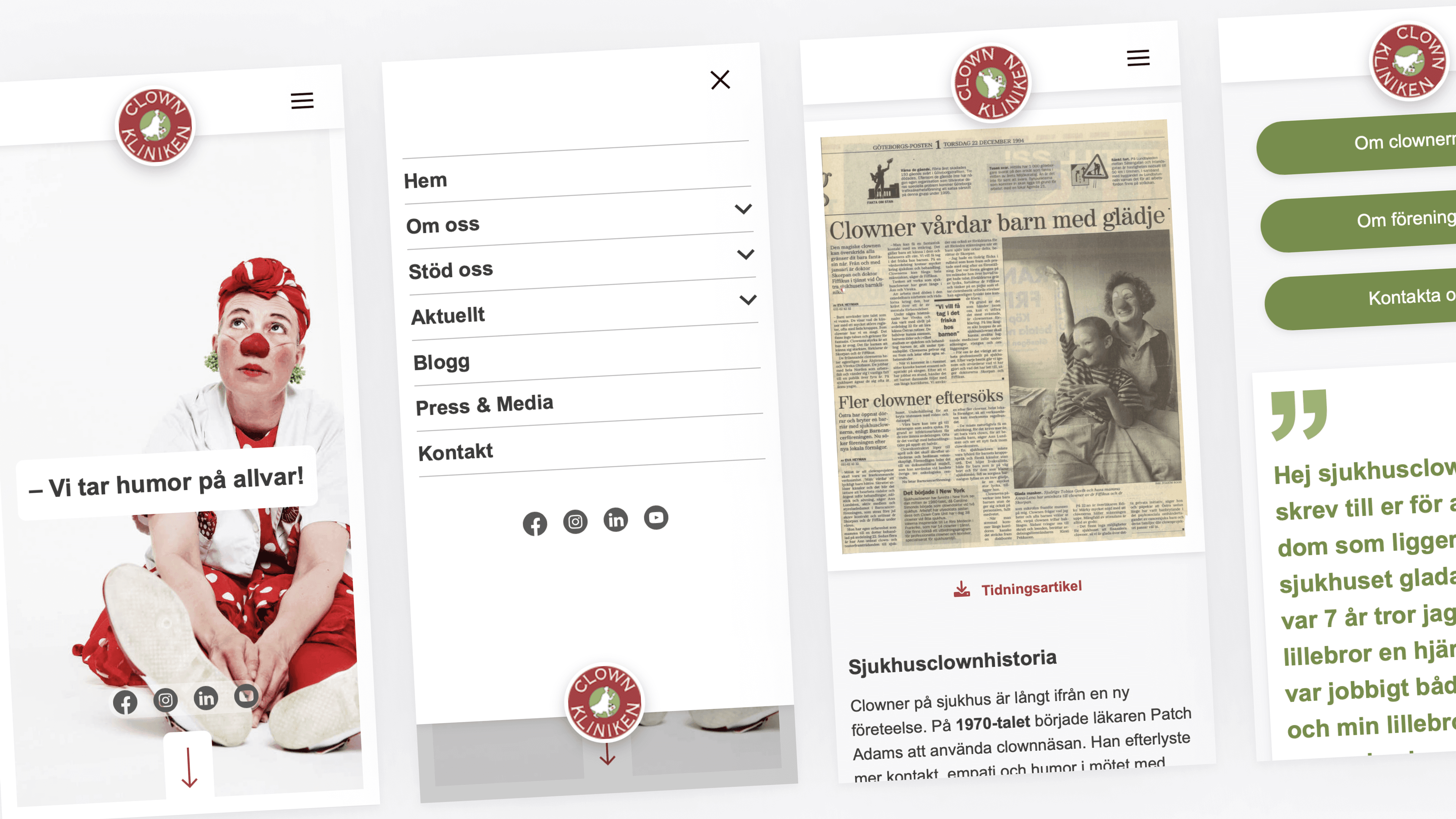 Vi är tacksamma för att vi fått chans att lära oss mer om Clownklinikens minst sagt positiva verksamhet och hoppas att den nya webbsidan leder till ett underlättat fortsatt arbete mot en gladare värld.
