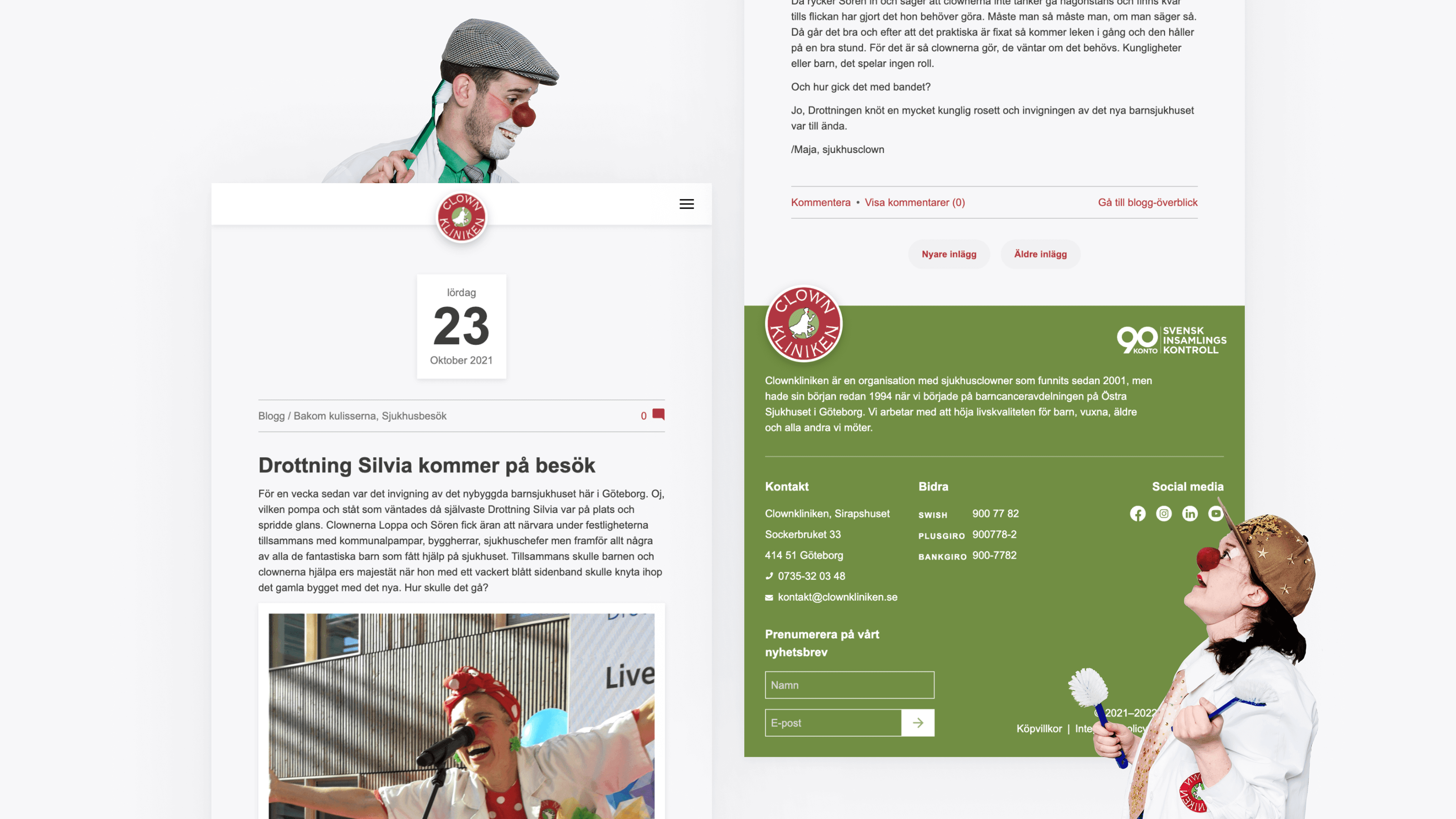 När Clownkliniken kom till oss och berättade om sina behov så tog vi chansen. Vi har ”Pro Bono” byggt en sida som är helt anpassad efter deras behov: ny och fräsch design, möjlighet att ta emot donationer på ett smidigt sätt, automatiskt generera gåvobevis, bygga in tidigare extern blog och inte minst vara högt tillgänglighetsanpassad.