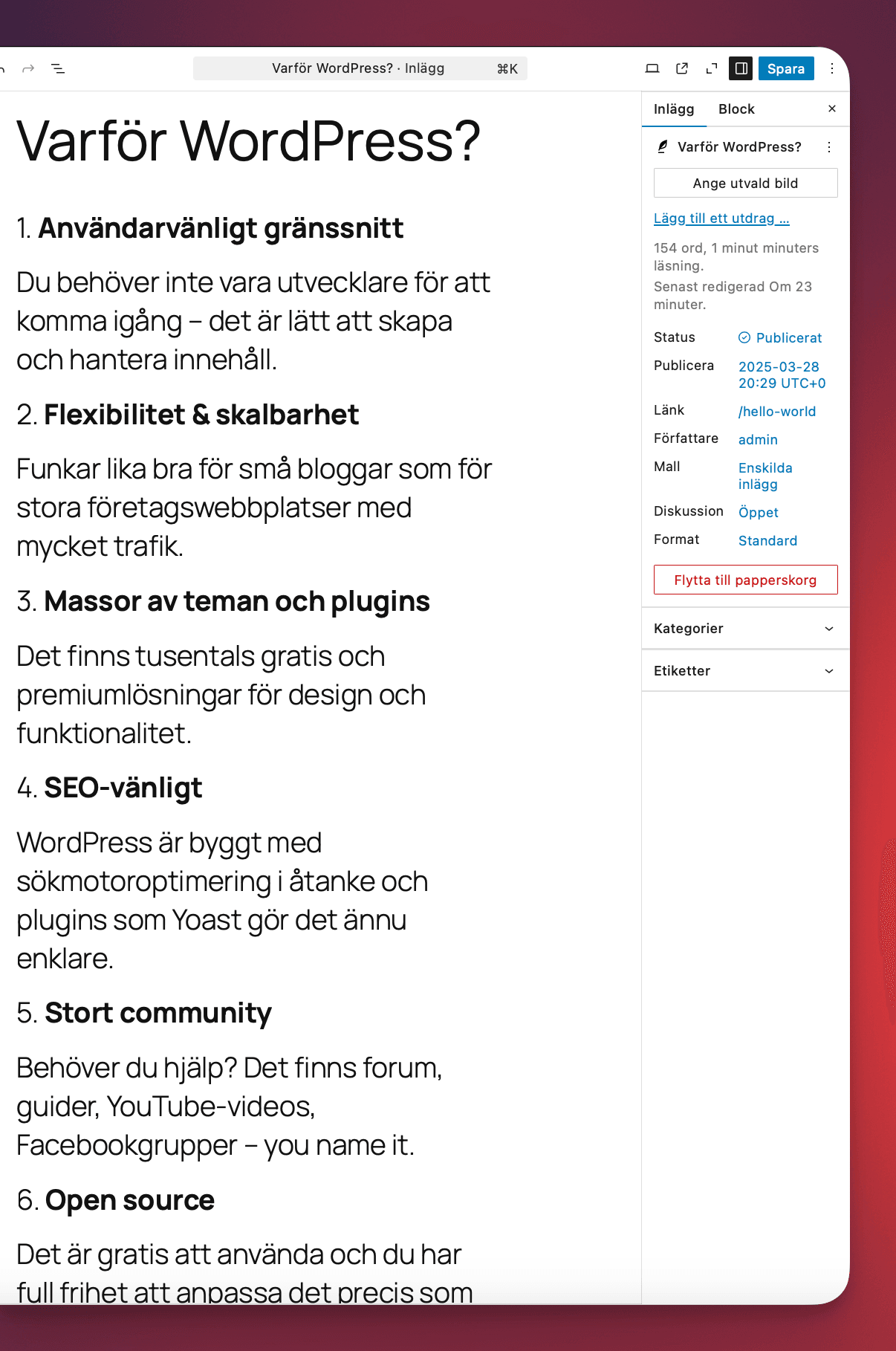 That there are several different types of CMS systems, we have already discussed here. Whether WordPress can even be classified as a CMS is something critics have long questioned, as WordPress upon installation is a relatively bare and feature-poor system. The fact that it has roots as a blogging tool, which in many respects is still true today, makes it feel like a weaker alternative to other, more complicated and complete CMS systems. This is, however, something that is solved with some of all the thousands of plugins that exist, where you can virtually find any function you can think of needing, ready to be installed and run.